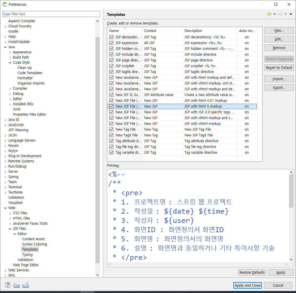 - Web > JSP Files > Editor > Templates로 이동합니다.