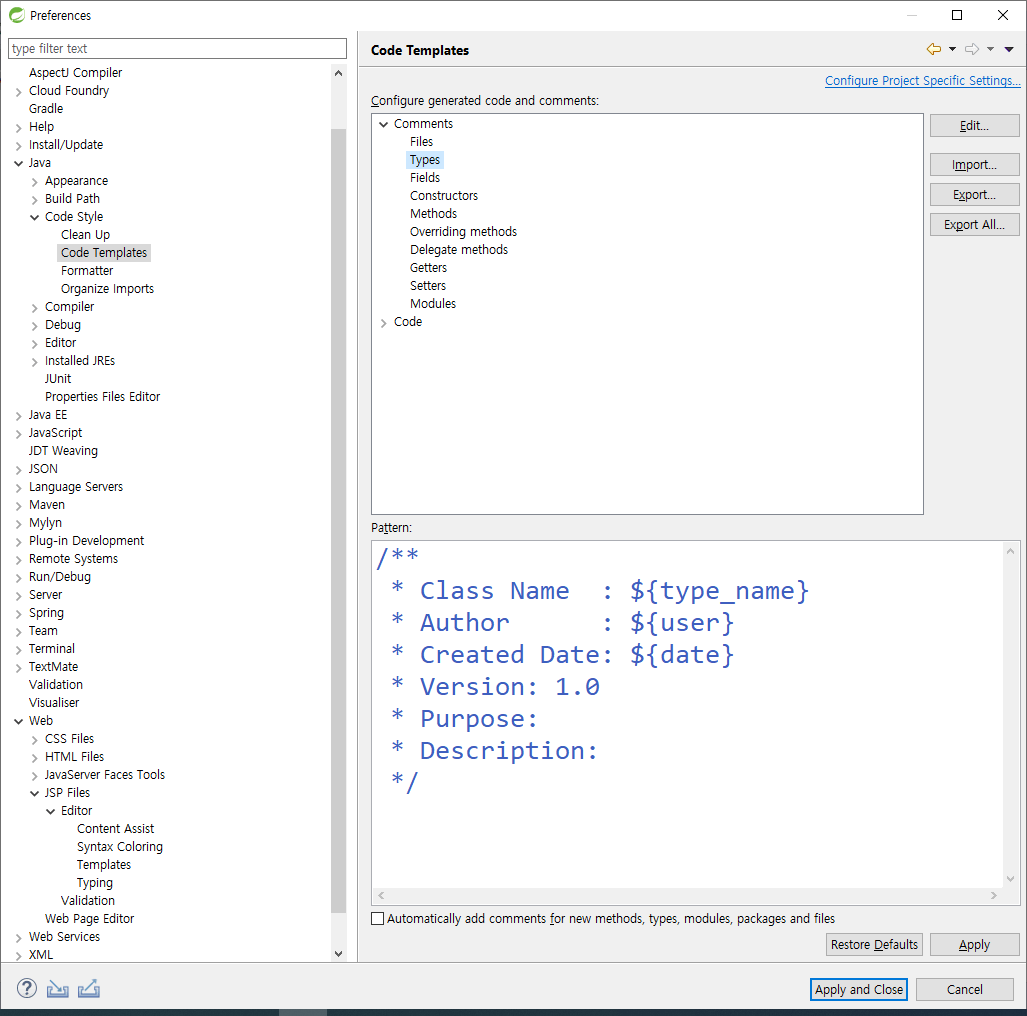 - Comments에서 Types (클래스 주석)와 Methods (메서드 주석)을 선택하여 편집합니다.
